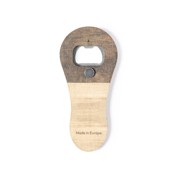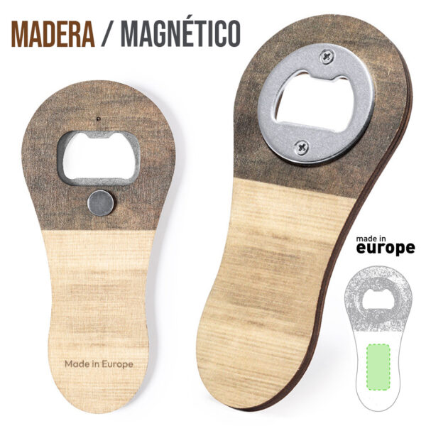 Abridor magnético fabricado en madera natural y de original acabado bicolor. Con mecanismo de apertura metálico, amplia superficie de marcaje y distintivo Made In Europe. Magnético