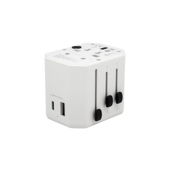 6,5 x 5,5 x 5,5 cm. Plástico ABS. Adaptador universal de viaje. Tipo de puertos: Americano y Europeo. Tipo de patas: redondas, cruzadas y paralelas. Toma múltiple. Puertos USB y USB C. Indicador led. Potencia: 100-250V, 10A MAX, 2500W MAX. Entrada: 100-250V, 50-60 HZ, 0.5A. Salida total usb: 5V/2.1 A, 2.1A máximo por puerto, Salida total DC: 10.5 W. Función CARGA RAPIDA, Presentación en caja de regalo kraft.