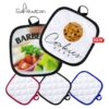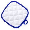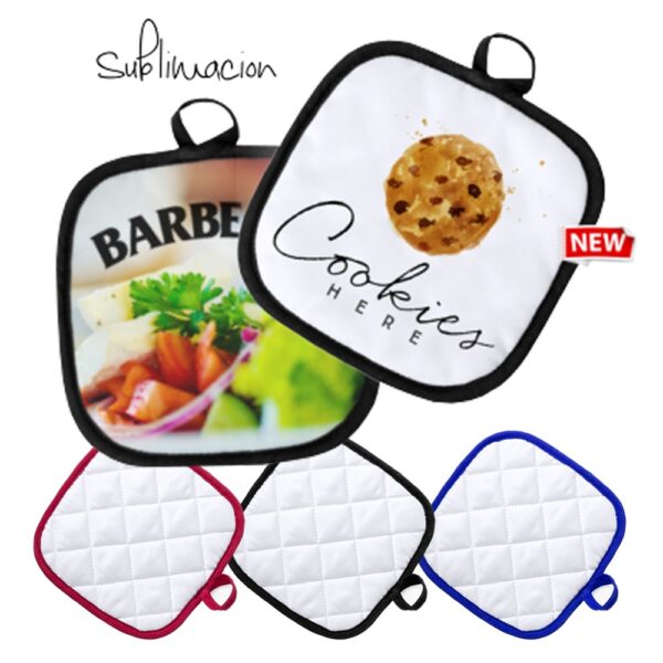 Agarrador de cocina en suave material 100% poliéster de suave acabado en color blanco y con bordes en vivos colores. Con una cara lisa especialmente diseñada para sublimación y cinta para colgar. Una Cara Lisa para Impresión