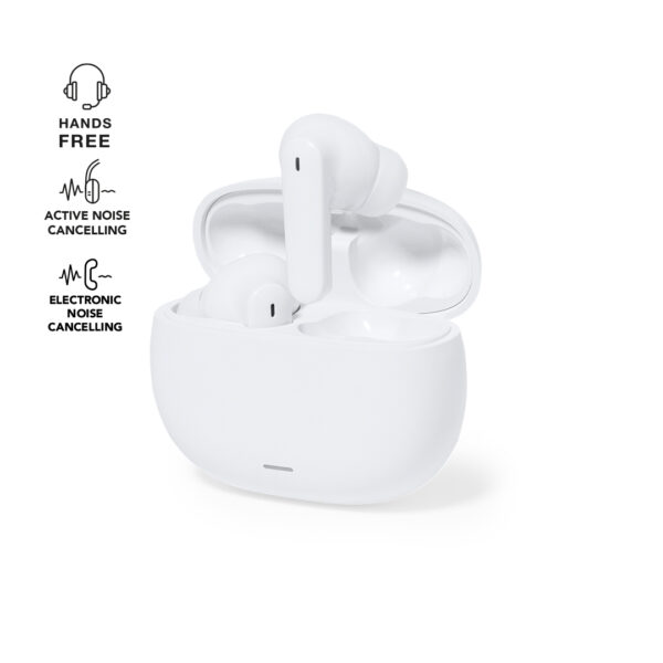 Auriculares intraurales con sistema ANC y ENC (Active Noise Cancellation / Electronic Noise Cancellation), que reduce considerablemente los ruidos externos para una experiencia sonora óptima. En elegante acabado blanco y con conexión Bluetooth 5,0. De diseño ergonómico, incluyen botón de control táctil integrado en el auricular, con base de carga a juego e indicador de estado de carga. Función manos libres y recargables por USB (cable incluido). Presentados en una atractiva caja de diseño kraft. Conexión Bluetooth. Batería 30 mAh/ Base Carga 230 mAh