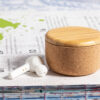 Auriculares intraurales de conexión Bluetooth® 5.0, con batería integrada de litio de 30 mAh en cada auricular y en elegante acabado de color blanco. De diseño ergonómico, incluyen botón de control táctil en el auricular y función manos libres. Base de carga en corcho natural con tapa en bambú. Base de 300 mAh de capacidad e indicador LED de estado de carga, con cable de carga Tipo C incluido. Presentación en caja individual de diseño kraft, con manual de instrucciones en español e inglés. Conexión Bluetooth. Batería 30 mAh/ Base Carga 300 mAh