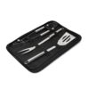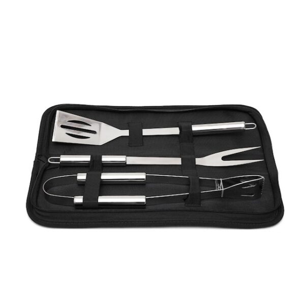 Set de utensilios para Barbacoa de acero inoxidable. Incluye tenedor, pinza y espátula. Presentado en funda con cierre.: 40 x 12 x 5,4 cm. LOGO24: Producto disponible para el servicio de logueo en 24 horas respetando unidades mínimas de logueo y 200 unidades máximas. Consultar términos y condiciones del servicio