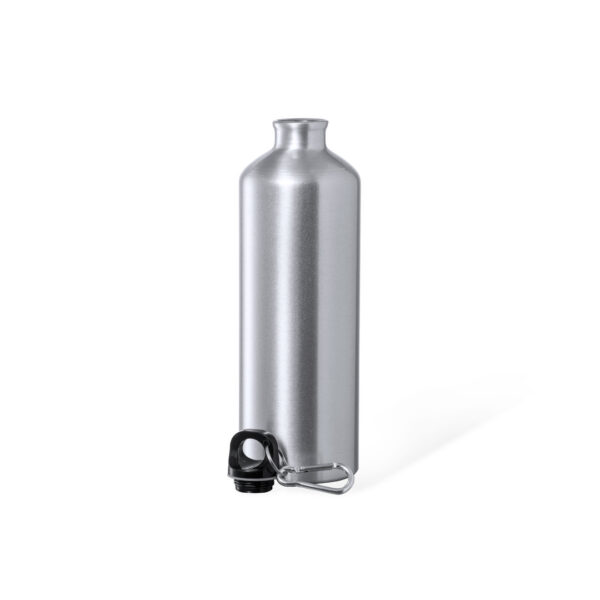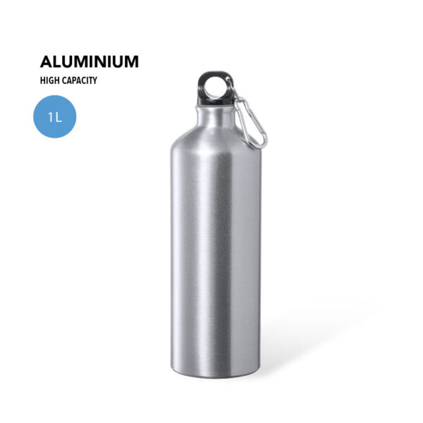 Bidón de 1 l de capacidad, fabricado en aluminio de acabado brillo. Tapón a rosca en negro, con anilla y mosquetón de transporte. Libre de BPA y presentado en caja individual de diseño kraft. 1 L