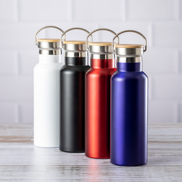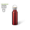 Bidón térmico de 500 ml de capacidad, fabricado en acero inox de doble pared. Incluye original tapón a rosca en acero inox, con detalle de bambú y asa integrada. Disponible en variada gama de colores y presentado en caja individual de diseño kraft. 500 ml