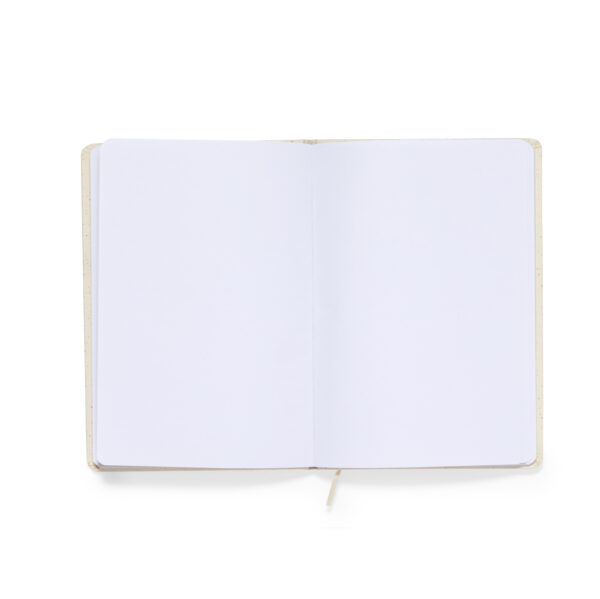 Bloc de notas A5 con tapas duras en resistente cartón reciclado. De 100 hojas blancas lisas y banda elástica para su cierre. Presentado en bolsa individual reciclada. Portada Rígida. 100 Hojas
