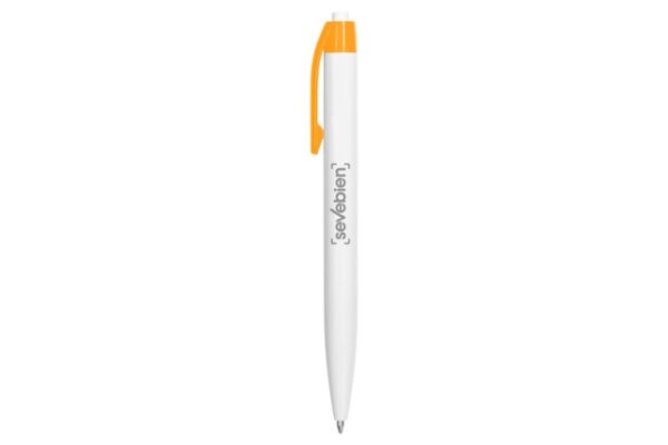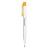 Plástico. Bolígrafo con pulsador. Cuerpo plástico de color blanco y clip de color. Tinta azul