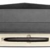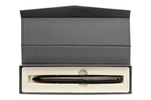 Metal. Cuerpo metálico mate. Clip de metal y punta plástica. Apertura giratoria. Tinta azul. Decape electroplateado en la parte superior. Presentación en estuche con cierre magnético.