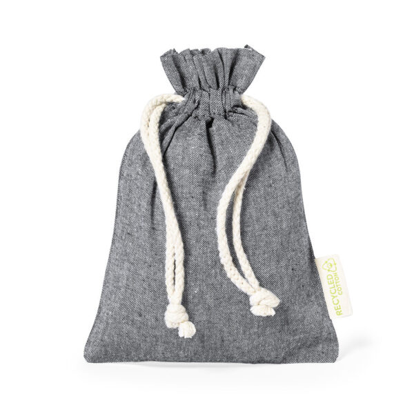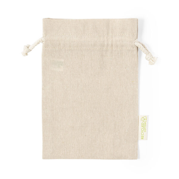 Bolsa eco-friendly en resistente material 100% algodón reciclado GRS de 120g/m2. Certificación GRS (Global Recycled Standard / Estándar de Reciclaje Global), que garantiza el origen reciclado del material usado para fabricar el producto. Cierre de cordón de algodón y acabado cosido, incluye etiqueta exterior con distintivo algodón reciclado.
