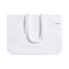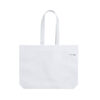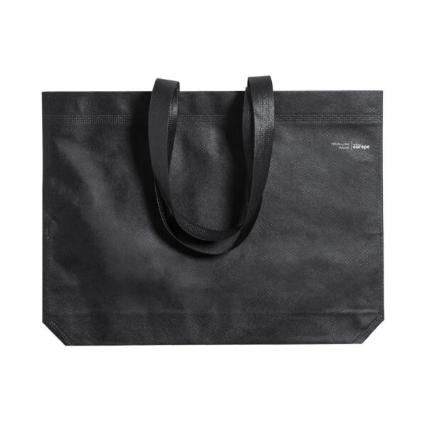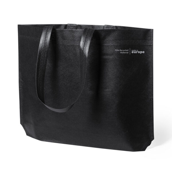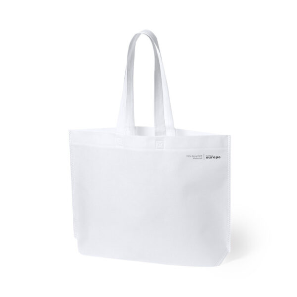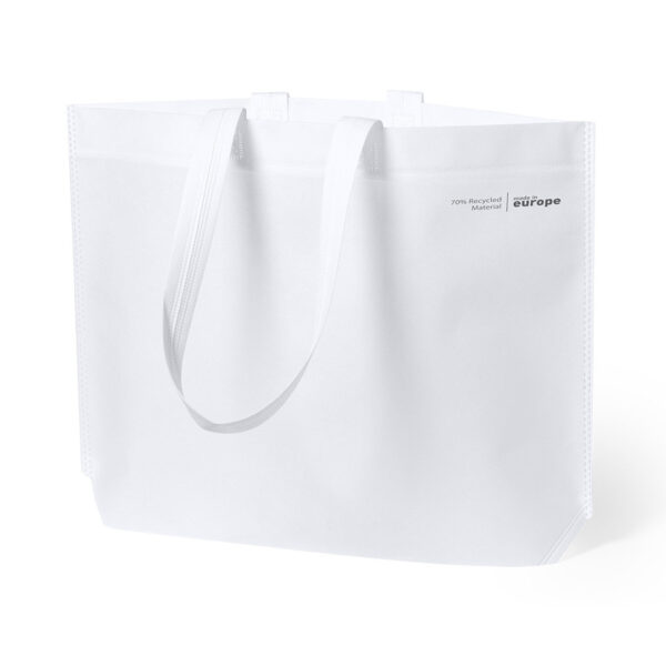 Bolsa de línea nature, fabricada en non-woven reciclado de 70g/m2. De fabricación europea, con acabado termosellado, con fuelle, asas largas y distintivo eco/made in sobre la bolsa.