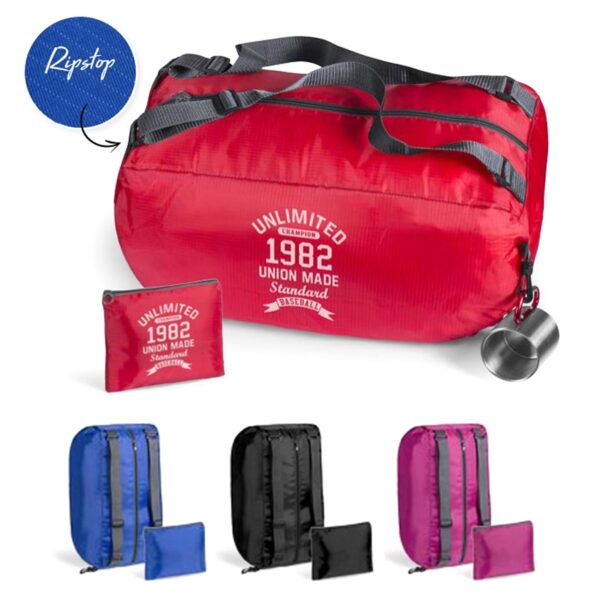 Bolso mochila plegable en suave y resistente material ripstop de alegres colores, con cierre de cremallera y accesorios en colores gris y negro. Asas/Cintas de hombro regulables y mosquetón de transporte. Plegado de pequeño tamaño. Plegable