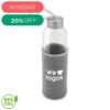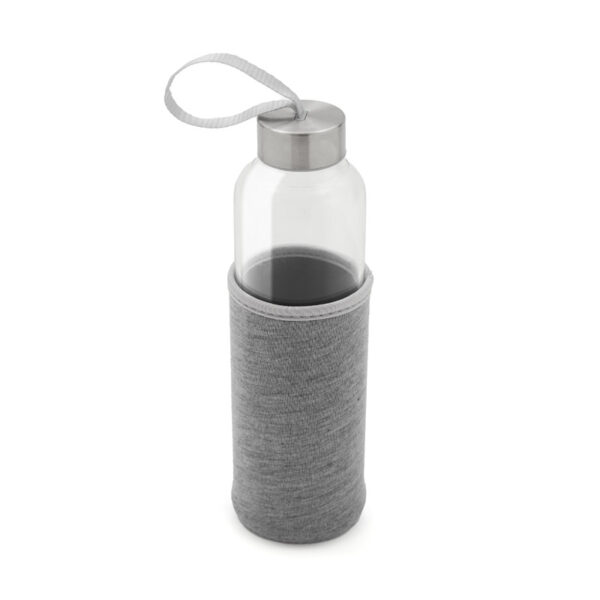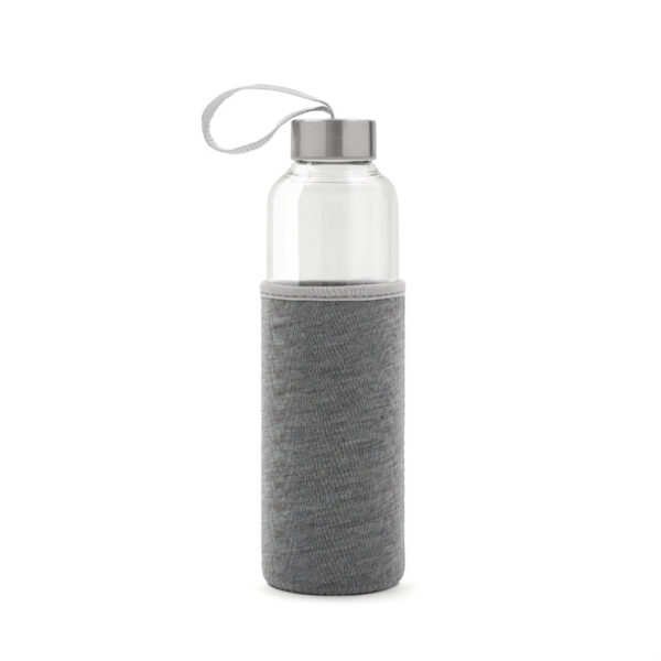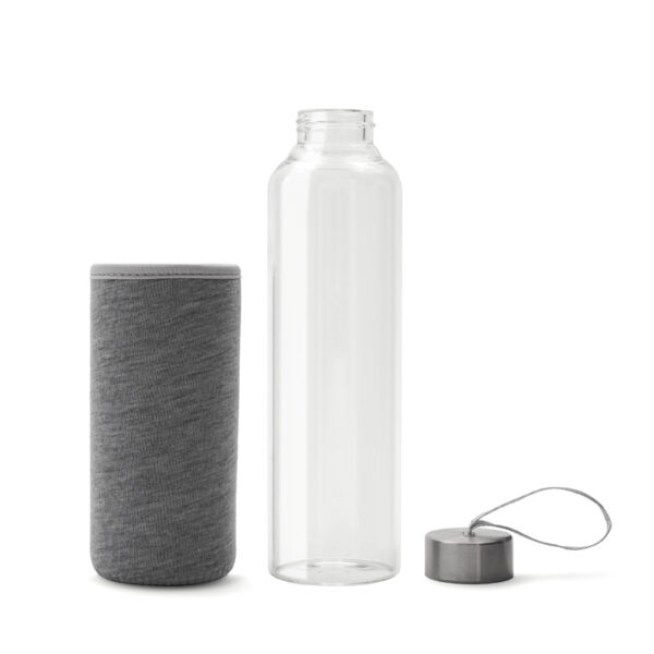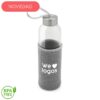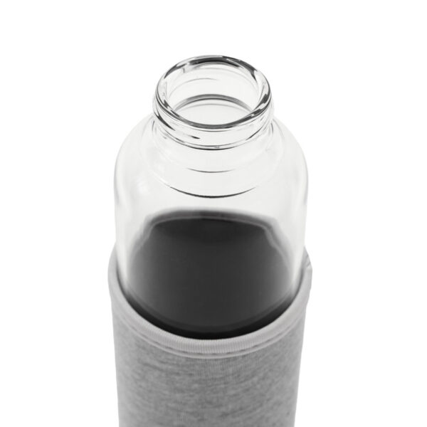 Botella de vidrio borosilicato con funda protectora de neopreno. Tapa a rosca con cinta, para facilitar el agarre y transporte. Capacidad de 550 ml. Reutilizable. Ideal para tus actividades al aire libre o uso diario. Incluye Gift Box confeccionada en cartulina Kraft.