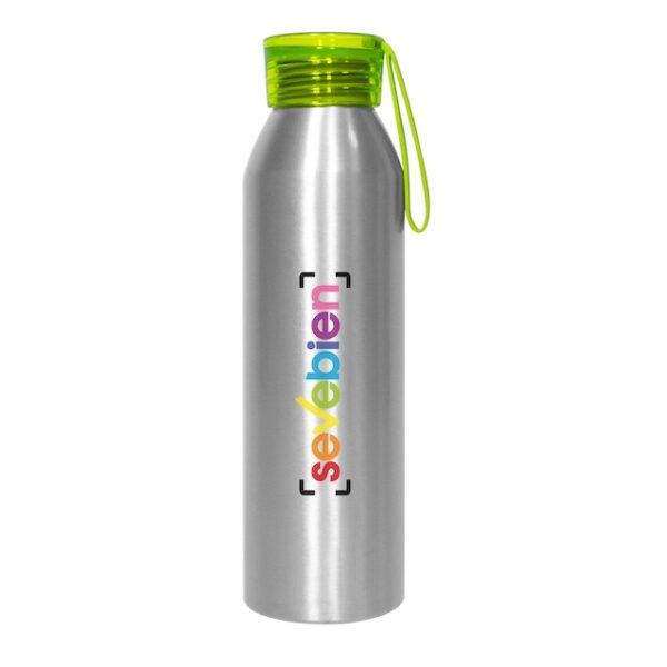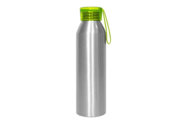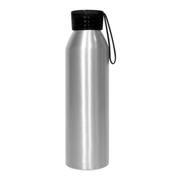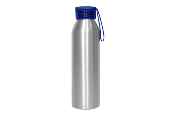 Ø 6,6 x 23 cm. Capacidad 600 ml. Aluminio. Cuerpo color plata, tapa de color traslucida con tira de silicona (de 8 cm) del mismo color. Ideal para hiodratarte todos los días. Presentación en caja de regalo.