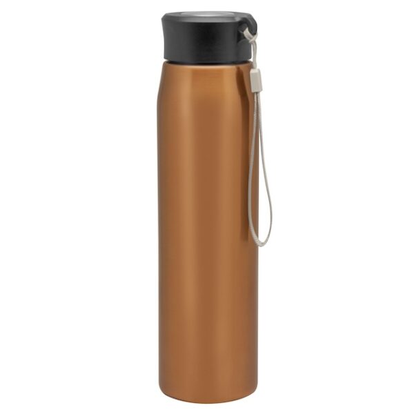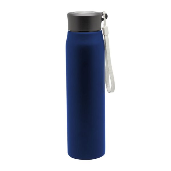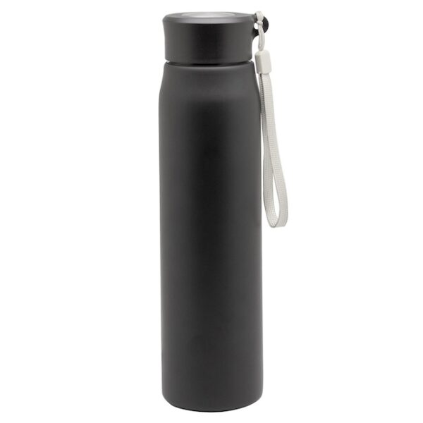 Ø 6,5 x 25 cm. Capacidad 800ml. Acero inoxidable. Botella de acero inoxidable 304. Tapa combinada en plástico y acero inoxidable 201 con tira de color gris de 12 cm de largo. Ideal para llevarla a todos lados. Presentación en caja de regalo.