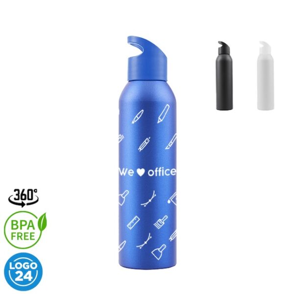 Sport Bottle reutilizable de aluminio con tapa rosca de PP y silicona. Cuenta con una tapa con agarre para facilitar su transporte. Producto libre de BPA. Medidas: 24 cm x Diámetro 6,6 cm. Capacidad: 650 ml. LOGO24: Producto disponible para el servicio de logueo en 24 horas respetando unidades mínimas de logueo y 200 unidades máximas. Consultar términos y condiciones del servicio
