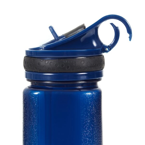 Botella de PP con boquilla vertedora deportiva. Cuenta con un agarre en la tapa. Medida: 23,7 cm x 6,2 cm. Capacidad: 650 ml.