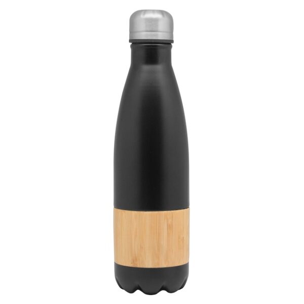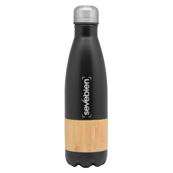 Ø7,4 x 26,8 cm. Capacidad 500 ml. Acero inoxidable. Botella doble pared, sellada al vacío. Interior en acero 304 y exterior en acero 201, con detalles de Bambú. Tapa de acero. Mantiene hasta 12 hs la temperatura de las bebidas calientes y 24 hs de las bebidas frías. Presentación en caja de regalo Kraft.