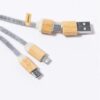 Cable cargador fabricado en bambú y fieltro RPET. Con conexiones de entrada Tipo C y USB y salidas Tipo C, lightning y Micro USB. 5V DC 2.4A. Presentado en bolsa individual de diseño kraft con autocierre, con distintivo en etiqueta. El fieltro RPET reciclado es fruto de la combinación del proceso de reciclaje de materiales plásticos junto a la técnica milenaria de fabricación del fieltro, dando como resultado un material de eco-tendencia que, además de ser de origen reciclado, también se convierte en reciclable. Conexión Micro USB, Tipo C y Lightning 5V DC 2.4A