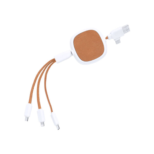 Cable cargador extensible de 1 m, fabricado en RABS y en elegante color blanco, con cables y detalles en cuero reciclado. Pieza central con cubierta en cuero reciclado y mecanismo interior que convierte al cable en extensible. Con conexiones de entrada Tipo C y USB; y salidas Tipo C,Lightning y Micro USB. 5V DC 2.4A El material RABS o ABS Reciclado y el cuero reciclado proceden del reciclado de artículos al final de su vida útil. Los materiales reciclados empleados incorporan la certificación RCS, que garantiza el origen reciclado de los mismos. Cable Extensible. Conexión Micro USB, Tipo C y Lightning 5V DC 2.4A