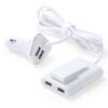 Cargador USB para mechero de coche de 3.100 mAh de capacidad de carga en elegante acabado de color blanco. Con salida dual para pasajeros delanteros y práctico cargador auxiliar con pinza para los pasajeros traseros. Con led indicador de carga y presentado en caja individual. 4 Salidas USB. 3100 mA