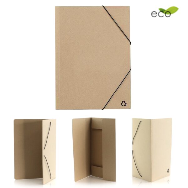 Carpeta ecológica de gran capacidad con cierre elástico en cartón reciclado flexible y con sistema de plegado tripe.