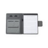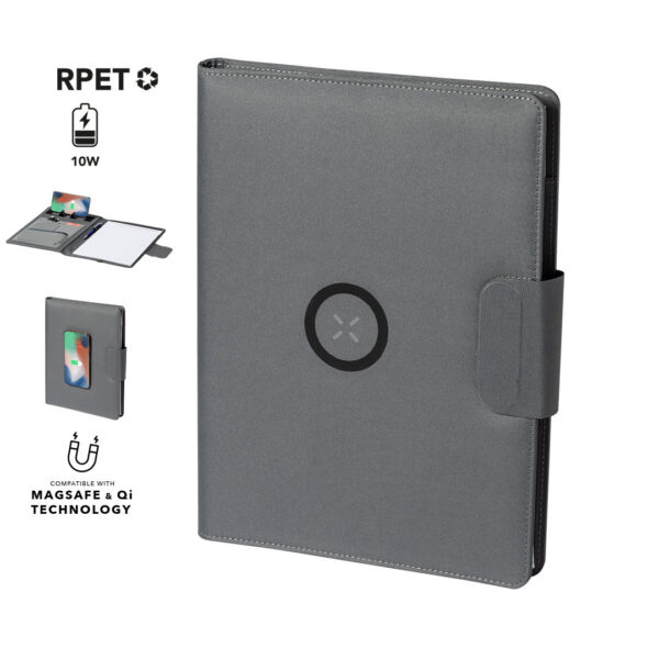 Carpeta/bloc multifunción fabricada en poliéster 300D RPET, elaborado a partir de plástico reciclado, para así fomentar la reutilización de residuos plásticos y ayudar a la sostenibilidad del planeta. Con cierre magnético y etiqueta interior con distintivo RPET. Incluye cargador inalámbrico 10W integrado en portada, con fijación magnética para poder usar el dispositivo mientras se produce la carga del mismo e incluyendo anillo adhesivo, válido para todos los dispositivos con tecnología Magsafe y Qi.Batería integrada de 5.000 mAh de capacidad de carga, con puerto Tipo C de entrada/salida y LEDs indicadores de estado de carga, con cable incluido.Interior con soporte para smartphone y multitud de compartimentos para tarjetas, incluidos soporte para bolígrafo y bloc A4 con 20 hojas de disposición a una raya. Presentada en atractiva caja individual de diseño.Las capacidades mostradas en todas nuestras baterías auxiliares externas son reales, incorporando todas ellas baterías de grado A y no recicladas, con una vida útil de al menos 500 ciclos de carga y según normativa CE. Además, están fabricadas conforme a los estándares RoHS y en cumplimiento con los siguientes requisitos de seguridad: Sistema de protección contra sobrecarga del power bank. Sistema de protección contra descarga completa que proporciona una mayor durabilidad del power bank. Sistema de bloqueo para evitar cortocircuitos. Sistema de transferencia de carga constante, acorde con la capacidad del dispositivo de destino. Inalámbrico 10W. Power Bank 5000 mAh. Salida USB. Entrada Micro USB. Bloc 20 Hojas