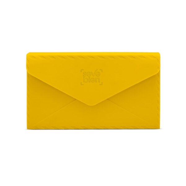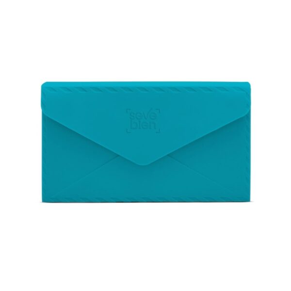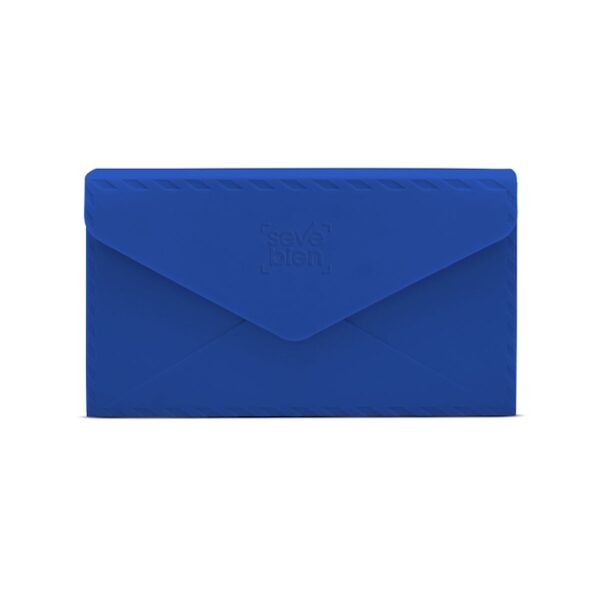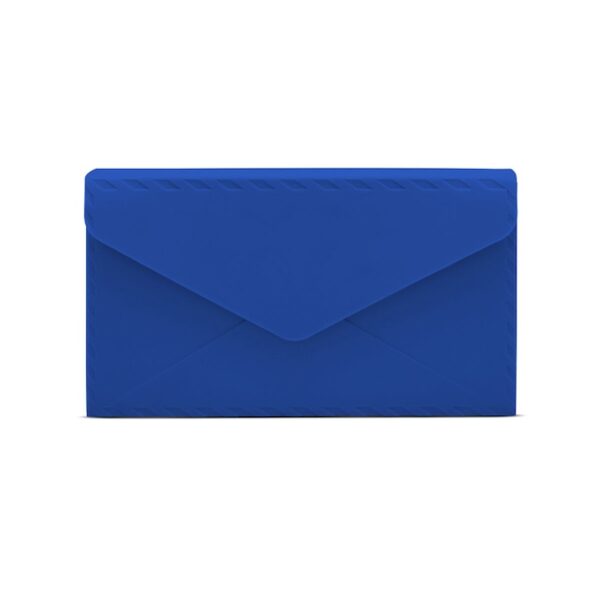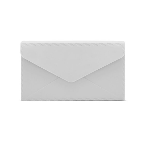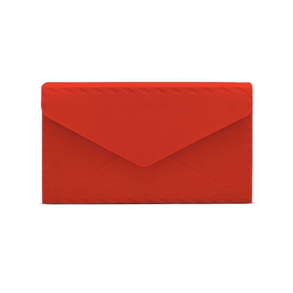 21,5 x 12,2 x 5 cm. Silicona. Cartera de mano en forma de sobre con solapa imantada y correa desmontable. Presentación en caja de regalo.