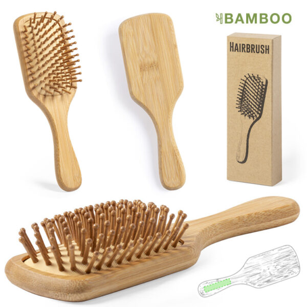 Cepillo de línea nature en bambú pulido, para así fomentar la utilización de materias primas naturales y reducir las emisiones contaminantes. Con amplia superficie de marcaje en mango y presentado en atractiva caja de diseño eco.