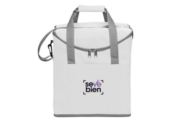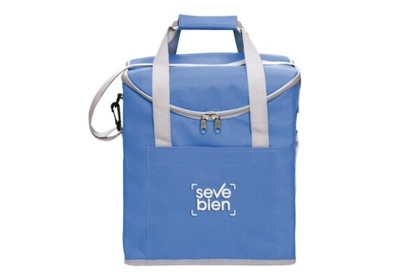 30 x 34 x 19,5 cm. Capacidad 37 litros. Poliéster. 600D Lonchera térmica con recubrimiento interior metalizado. Un bolsillo frontal y dos bolsillos laterales de red. Correa tipo bandolera y dos manijas reforzadas con cierre de velcro. Capacidad hasta 6 botellas de 2,5 litros