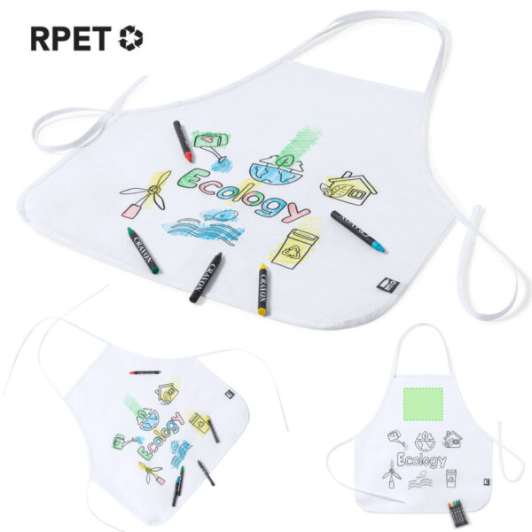 Delantal fabricado en non-woven RPET de color blanco, especialmente diseñado para colorear con ceras. Incluye 5 ceras en variados colores. Con cintas de ajuste en cuello y cintura. Distintivo RPET en etiqueta exterior. El material RPET se elabora a partir de plástico reciclado, para así fomentar la reutilización de residuos plásticos y ayudar a la sostenibilidad del planeta. Talla Única. Niño. 5 Ceras Incluidas