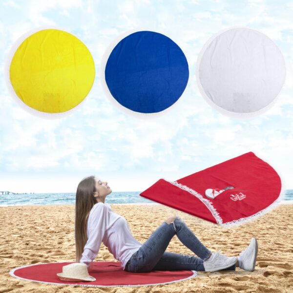 Esterilla en material 100% algodón de 125g/m2 en original diseño circular de vivos colores y terminación en flecos. *Para pedidos con impresión, se debe incrementar el coste del marcaje + 0,20 / unidad en concepto manipulación especial*