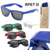 Gafas de sol de línea nature con protección UV400. Montura y patillas en RPET, elaborado a partir de plástico reciclado para así fomentar la reutilización de residuos plásticos y contribuir a la sostenibilidad del planeta. Lentes AC (acetato de celulosa) en color negro, disponibles en variada gama de colores. Presentada en atractiva bolsa de diseño eco. Protección UV400
