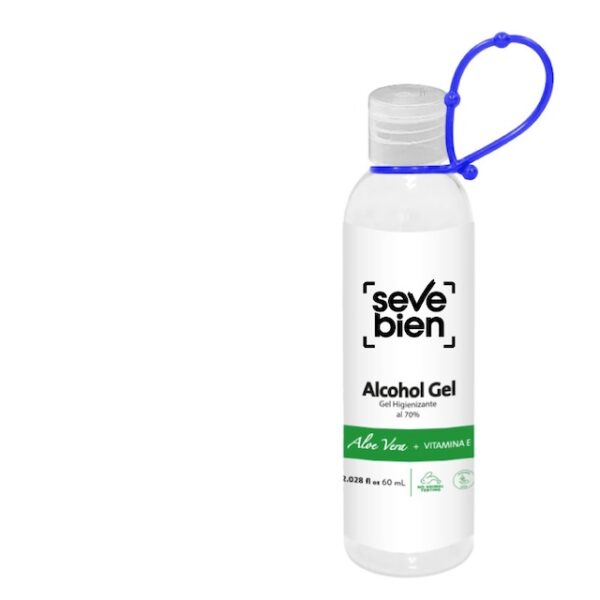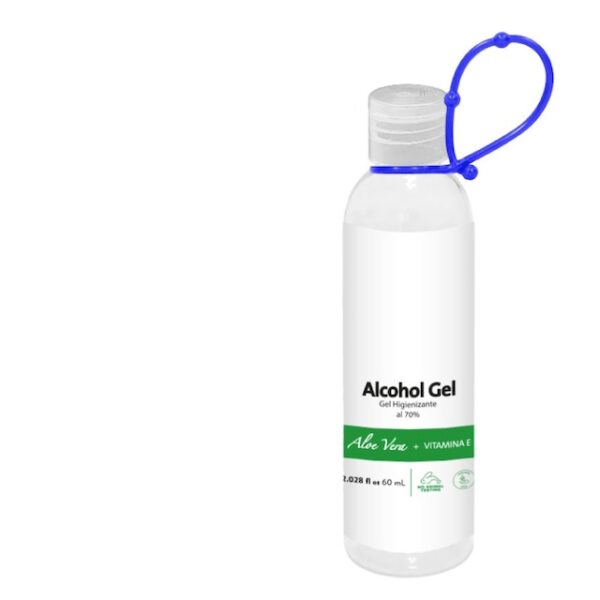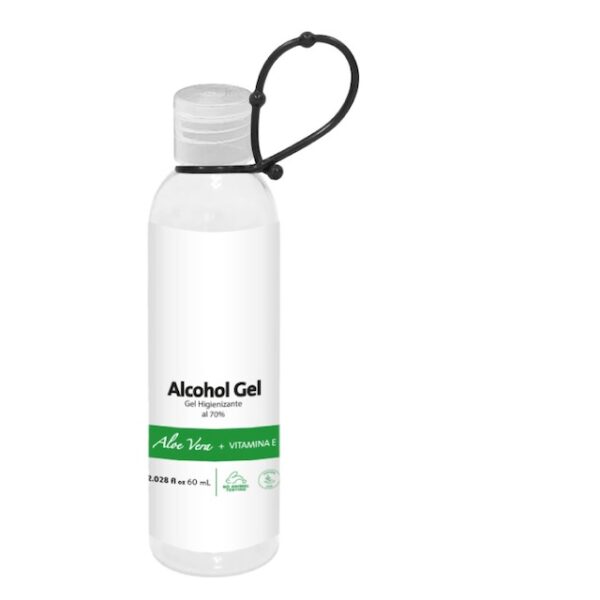 Ø 3,11 x 10,74 cm. Capacidad 60 ml. Plástico. Alcohol en gel antibacterial semi sólido (viscoso, suave, homogéneo, incoloro) en botella transparente con tapa flip top. Alcohol al 70% lo cual hace que tenga un alto poder germicida. Contiene aloe vera y vitamina E.