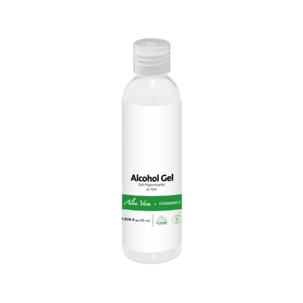 Ø 3,11 x 10,74 cm. Capacidad 60 ml. Plástico. Alcohol en gel antibacterial semi sólido (viscoso, suave, homogéneo, incoloro) en botella transparente con tapa flip top. Alcohol al 70% lo cual hace que tenga un alto poder germicida. Contiene aloe vera y vitamina E.