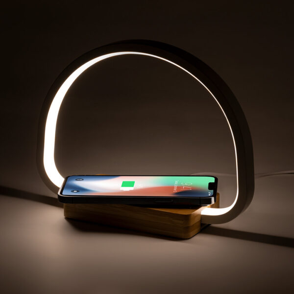 Lámpara cargador de diseño eco. Fabricada en bambú procedente de cortes naturales y con base antideslizante. Cargador inalámbrico 10W integrado. Incluye 52 LEDs y 3 posiciones de iluminación (cálida, fría y media), con intensidad de luz regulable. Compatible con dispositivos móviles de carga inalámbrica y conexión USB. Incluye cable cargador Tipo C y viene presentada en una atractiva caja de diseño eco. Disponible manual de instrucciones en español e inglés. 52 Ledes. 3 Posiciones de Luz. Intensidad de Luz Regulable. Conexión USB. Inalámbrico 10W. Salida USB