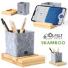 Lapicero de línea nature fabricado en fieltro RPET, con soporte para smartphone en bambú. Con distintivo fieltro RPET y presentado en caja individual de diseño kraft. El fieltro RPET reciclado es fruto de la combinación del proceso de reciclaje de materiales plásticos junto con la técnica milenaria de fabricación del fieltro, dando como resultado un material de eco-tendencia que, además de ser de origen reciclado, también se convierte en reciclable.
