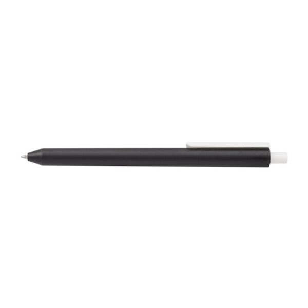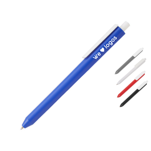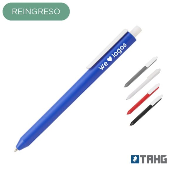 Lápiz confeccionado en ABS, con clip en color blanco. Apertura con pulsador retractil. Tinta azul.