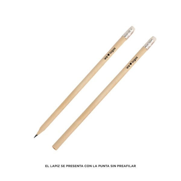 Lápiz grafito con goma. Realizado en madera con detalle de aluminio en reborde de goma. Material de la goma: Caucho. Punta sin preafilar. Medidas: 189 mm x Diámetro 0,8 mm. Mina: 2mm.