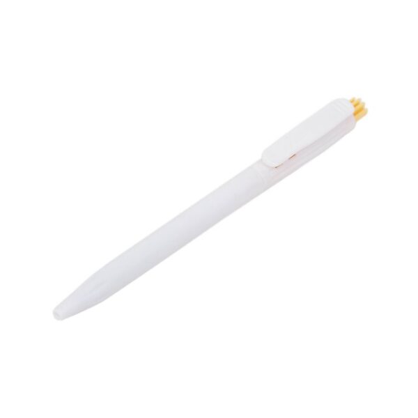 Lápiz confeccionado en ABS, de cuerpo de color blanco y clip en color. Apertura con pulsador. Tinta Azul.