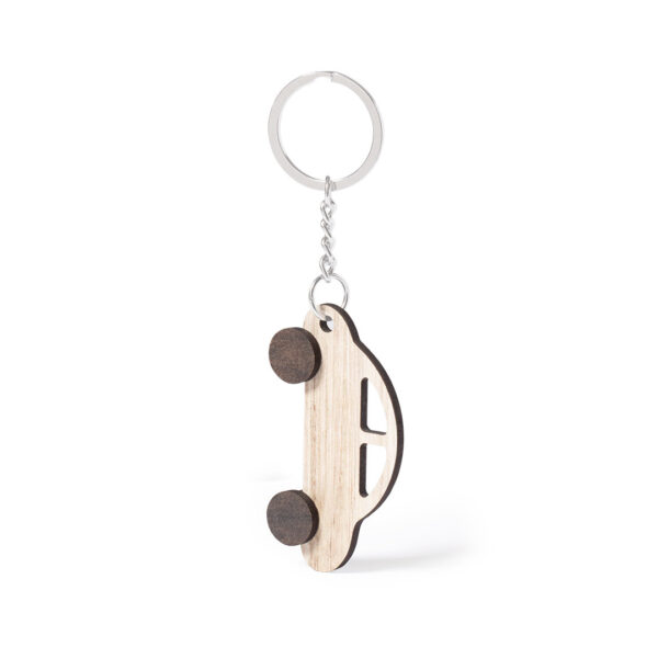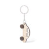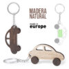 Llavero con diseño coche, fabricado en madera natural y de original acabado bicolor. Amplia superficie de marcaje, con anilla y cadena metálicas y distintivo Made In Europe.