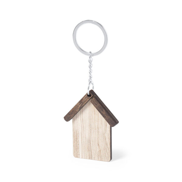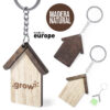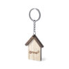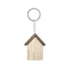 Llavero con diseño casa, fabricado en madera natural y de original acabado bicolor. Amplia superficie de marcaje, con anilla y cadena metálicas y distintivo Made In Europe.