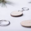 Elegante llavero de línea nature. Piezas obtenidas al corte de madera de haya, por lo que su textura, color y grosor pueden variar, convirtiéndolo así en una pieza única.Con amplia superficie de marcaje y disponible en diseños ovalado y redondeado.