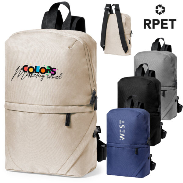 Mochila fabricada en resistente poliéster 600D RPET. Compartimento principal con cierre de cremallera invisible, doble bolsillo exterior y cintas para hombros ajustables. Disponible en variada gama de colores, con distintivo RPET en etiqueta exterior. El material RPET se elabora a partir de plástico reciclado, para así fomentar la reutilización de residuos plásticos y ayudar a la sostenibilidad del planeta. Parte Trasera Acolchada