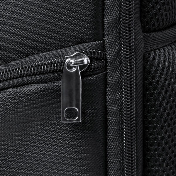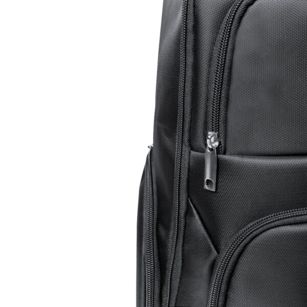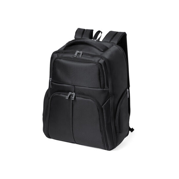 Mochila de calidad premium fabricada en resistente Nyon 600D de acabado en color negro. Compartimento principal con cierre de cremallera a juego y doble tirador. Incluye 3 bolsillos exteriores y 2 bolsillos laterales, todos con cierre de cremallera. Acolchado en asa, parte trasera y cintas para hombros, que además son ajustables. Interior con compartimentos acolchados para ordenador portátil de hasta 17 pulgadas y tablet de hasta 12 pulgadas. Accesorio en espalda para ajuste en trolley. Bolsillo Acolchado para Portátil y Tablet. Parte Trasera y Cintas Acolchadas
