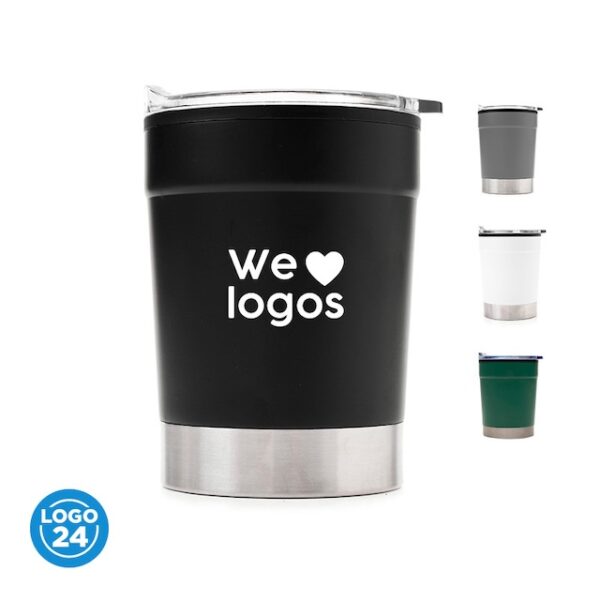 Mug térmico realizado en acero inoxidable en su exterior, y polipropileno de color negro en su interior, con tapa transparente cristal clear con cierre. Producto libre de BPA. Interior realizado en plástico. Medidas: 12 cm x Diámetro 8.5 cm. Capacidad: 360 ml. LOGO24: Producto disponible para el servicio de logueo en 24 horas respetando unidades mínimas de logueo y 200 unidades máximas. Consultar términos y condiciones del servicio.Incluye Gift Box confeccionada en cartulina Kraft.