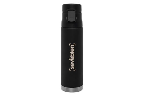Ø 7 x 25,5 cm. Capacidad 500 ml. Acero inoxidable. Mug doble pared. Interior de acero 304 y exterior de acero 201. Tapa plástica con botón a presión de apertura. Traba de seguridad. Mantiene las bebidas frías y calientes por más tiempo. Presentación en caja de regalo.