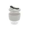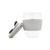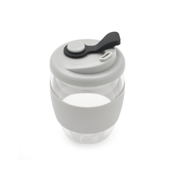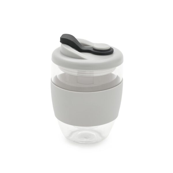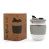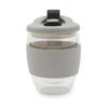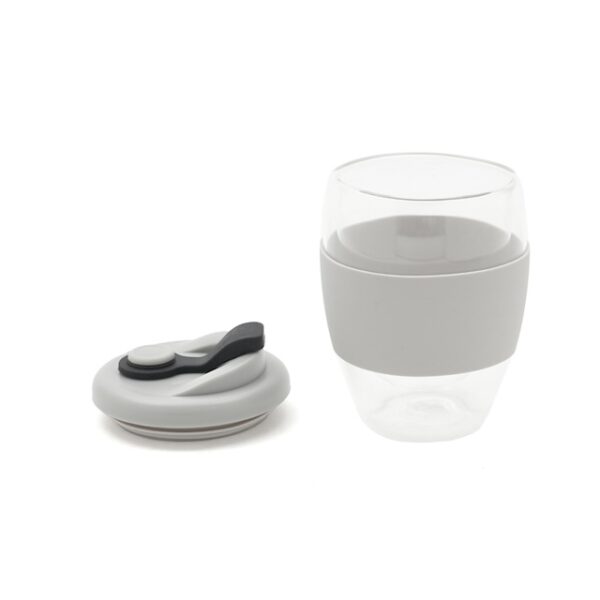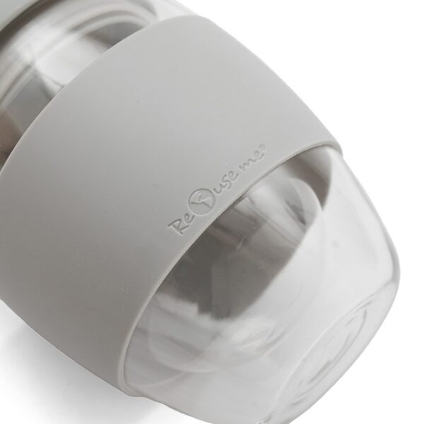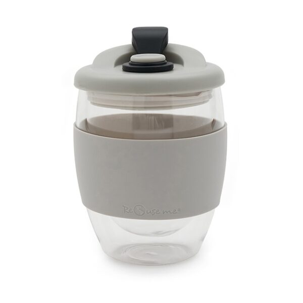 Mug reutilizable confeccionado en vidrio de doble pared de borosilicato. Gracias a su doble pared, no transmite el calor de la bebida a la manos. Cuenta con tapa con boquilla con cierre a presión y banda de silicona gris antideslizante personalizable. Capacidad: 350 ml. Medidas: 14,5 x 8,5 (Altura x Diámetro). Se presenta en GiftBox. ReUseMe. Incluye Gift Box confeccionada en cartulina Kraft.