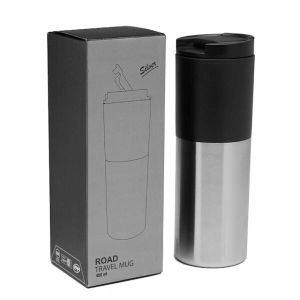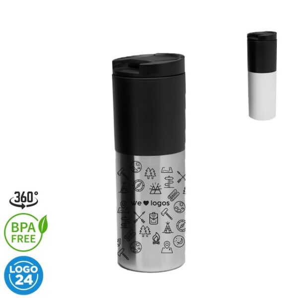 Mug térmico realizado con aluminio e interior de polipropileno negro. Boquilla regulable. Doble pared plástica. Packaging: Caja Impresa. Medidas: 22 cm x Diámetro 7,5 cm. Interior realizado en plástico. Capacidad: 450 ml. Producto libre de BPA. LOGO24: Producto disponible para el servicio de logueo en 24 horas respetando unidades mínimas de logueo y 200 unidades máximas. Consultar términos y condiciones del servicio
