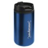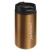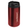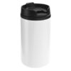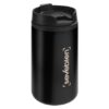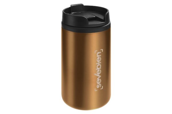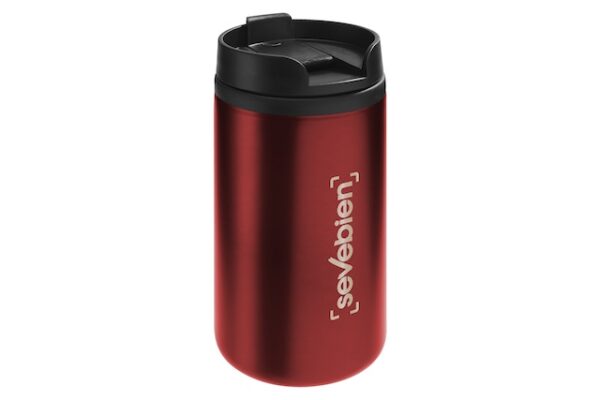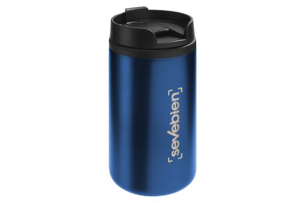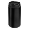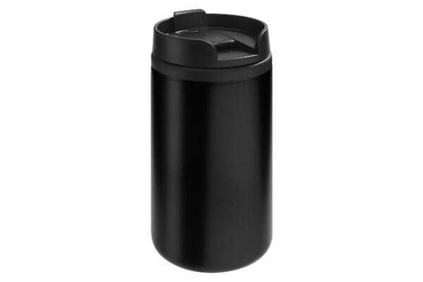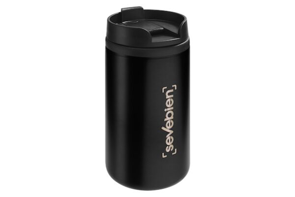 Ø 7 x 14 cm. Capacidad 290 ml. Acero inoxidable y plástico. Mug doble pared, interior de plástico y exterior de acero inoxidable. Tapa a rosca plástica color negro con cierre a presión antiderrame. Base antideslizante. Presentación en caja de regalo.