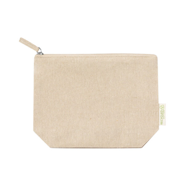 Neceser en resistente material 100% algodón reciclado GRS de 180g/m2. Certificación GRS (Global Recycled Standard / Estándar de Reciclaje Global), que garantiza el origen reciclado del material usado para fabricar el producto. Cierre de cremallera con tirador a juego y distintivo eco en etiqueta exterior.