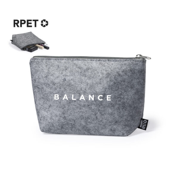 Neceser de línea nature y en resistente fieltro RPET, fruto de la combinación del proceso de reciclaje de materiales plásticos junto con la técnica milenaria de fabricación del fieltro, dando como resultado un material de eco-tendencia que, además de ser de origen reciclado, también se convierte en reciclable. Con cierre de cremallera, tirador a juego y etiqueta exterior con distintivo RPET.